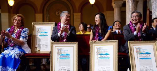 22日的亚太裔传统月庆贺仪式由洛杉矶市韩裔市议员兼亚太裔传统月联合主席David Ryu主持,市议会议长维森(Herb J. Wesson)、市检察长福尔(Mike Feuer)、市主计长盖尔普芮恩(Ron Galperin)分别致贺词。