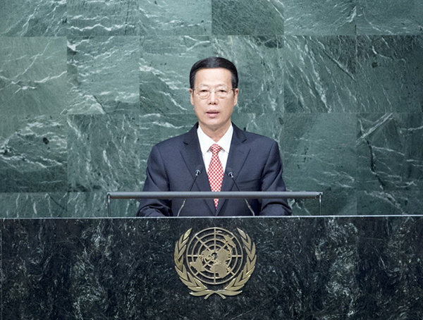 4月22日,国家主席习近平特使、国务院副总理张高丽在纽约联合国总部出席《巴黎协定》高级别签署仪式,并代表中国签署《巴黎协定》。张高丽在签署仪式开幕式上发表题为《推进落实〈巴黎协定〉共建人类美好家园》的讲话。新华社记者 王晔 摄