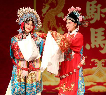 图为“文华奖”“梅花奖”得主吴亚玲(左)和获得“梅花奖”的孙娟共同表演的经典黄梅戏《女驸马》一折《洞房》。