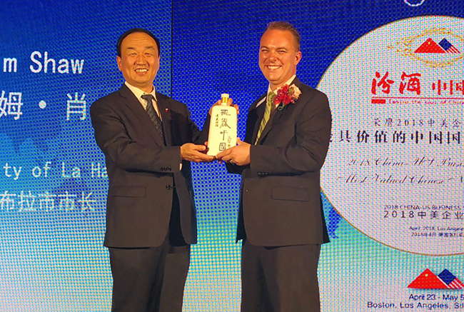 杨建峰代表汾酒集团向加州拉哈布拉市市长蒂姆•肖赠送限量收藏版“青花汾酒 徐冰艺术臻藏酒”