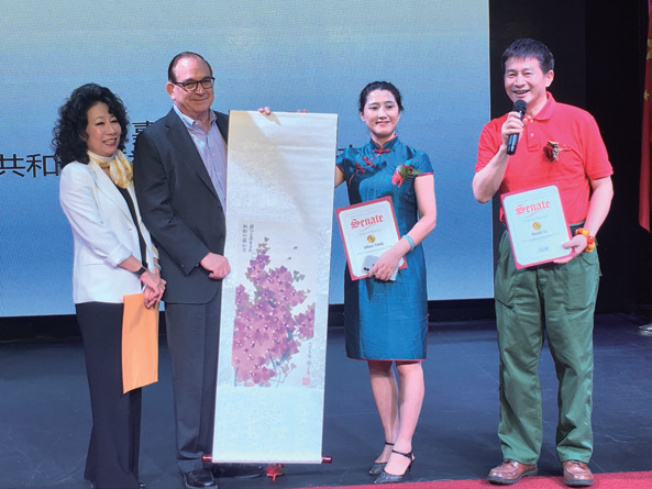 加州参议员夏乐柏(夫人何美眉翻译)向牧之教授夫妇颁发贺状。