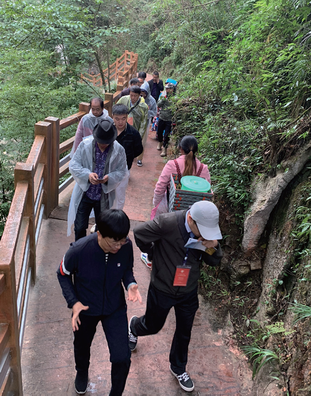 大方县宣传部长章育(左)陪同考察雨冲乡玻璃栈道。