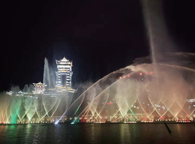 七星关区同心步行街音乐喷泉夜景。