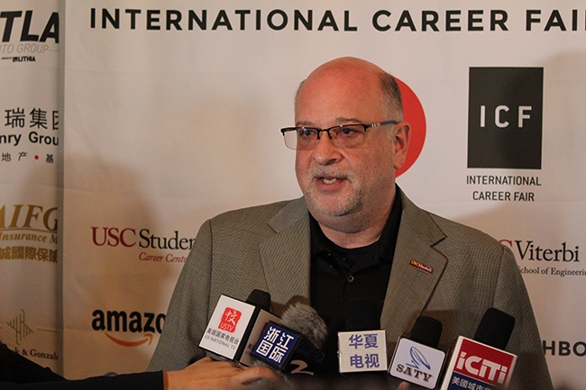 南加州大学马歇尔分校校长在HG+国际人才招聘会期间接受媒体采访。