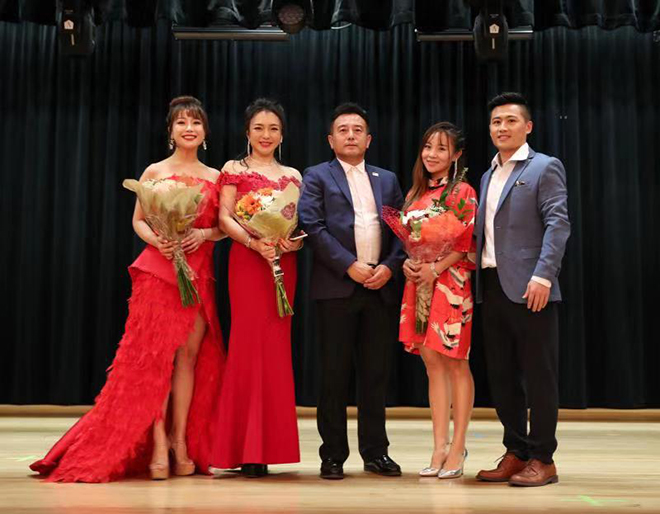 美國遼寧總商會会长任成勇(中)与活动三个主持人和导演在舞台上