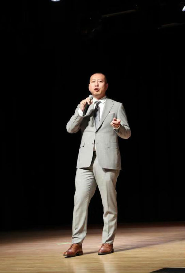 加州68选区州议员候选人Benjamin Yu在演出前致辞