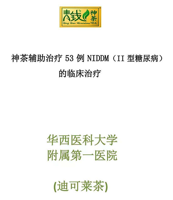 经北京协和医院、上海市第一人民医院、中国中医研究院西苑医院、华西医科大学一附院、江西医学院一附院和江西省人民医院等医疗机构对青钱柳降糖神茶的临床验证,结果惊奇地发现降糖神茶(迪可莱茶)对糖尿病有明显的治疗作用,糖尿病患者在服用青钱柳制成的饮品一个周期后,临床症状消失或减轻,空腹血糖明显下降,病人的血浆胰岛素浓度有升高。
