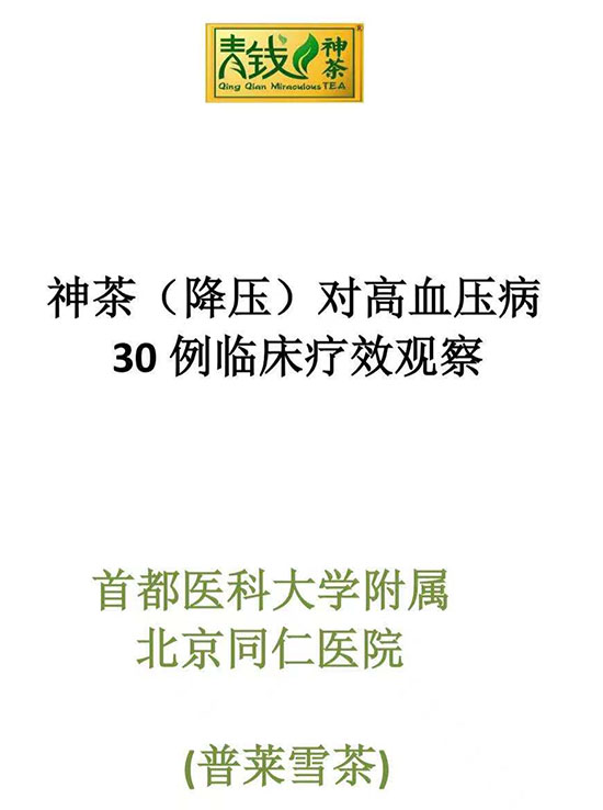 为了更好地发挥青钱柳的功效,神茶公司和中国中医研究院、江西中医学院、江西医学院等医药专家合作,根据祖国传统医学与现代医学理论,以青钱柳叶为主,配合黄芪等药食两用植物,研制成青钱柳降糖神茶;经北京协和医院、上海市第一人民医院、中国中医研究院西苑医院、华西医科大学一附院、江西医学院一附院和江西省人民医院等医疗机构对青钱柳降糖神茶的临床验证,结果惊奇地发现降糖神茶对糖尿病有明显的治疗作用,糖尿病患者在服用青钱柳制成的饮品一个周期后,临床症状消失或减轻,空腹血糖明显下降,病人的血浆胰岛素浓度有升高。