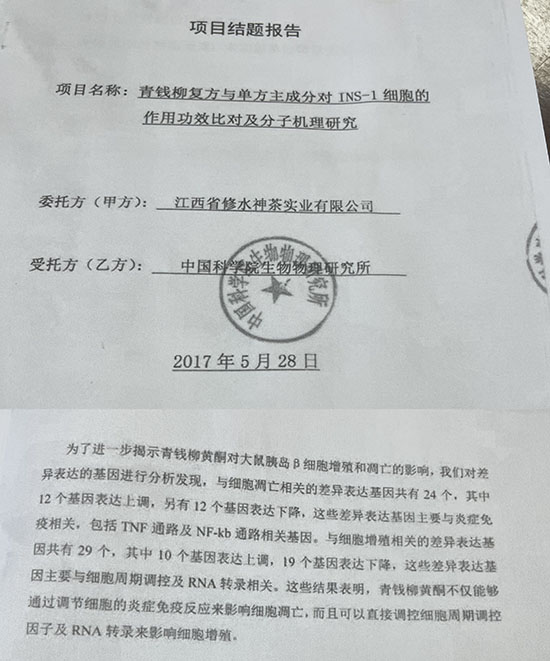 修水神茶公司还委托中国科学院生物物理研究所进行“青钱柳复方与单方主成分对INS—1细胞的作用功效比对及分子机理研究”,研究结果发现,青钱柳复方(青钱柳迪可莱茶主成分)和青钱柳单方能促进胰岛细胞增殖能力,而且青钱柳复方比青钱柳单方效果更明显;同时还发现青钱柳复方对脂毒性诱导的胰岛细胞凋亡具有保护作用。胰岛 细胞增殖能力下降及凋亡增加是导致糖尿病发生的重要诱发因素。