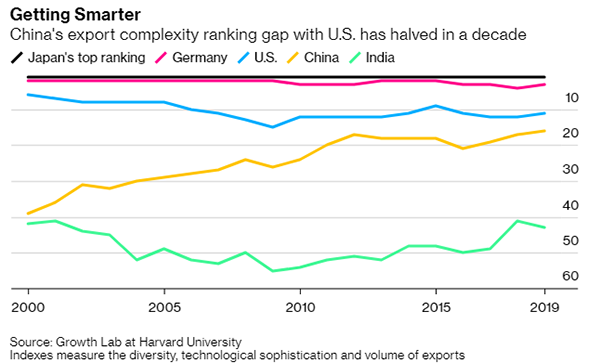 彭博社8月4日援引哈佛大学增长实验室(Growth Lab)的最新研究指出,尽管受到美中贸易战的冲击,中国出口商品的技术水平依然有所提高。且该研究预测,中国经济在未来10年的增长速度将超过。