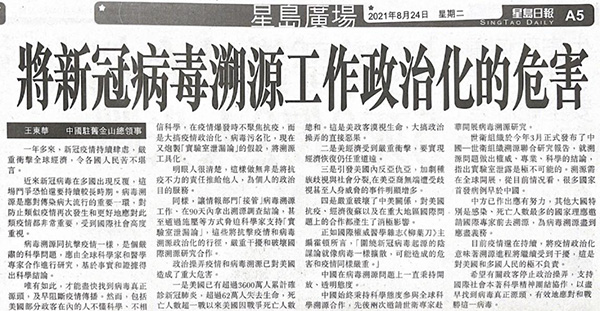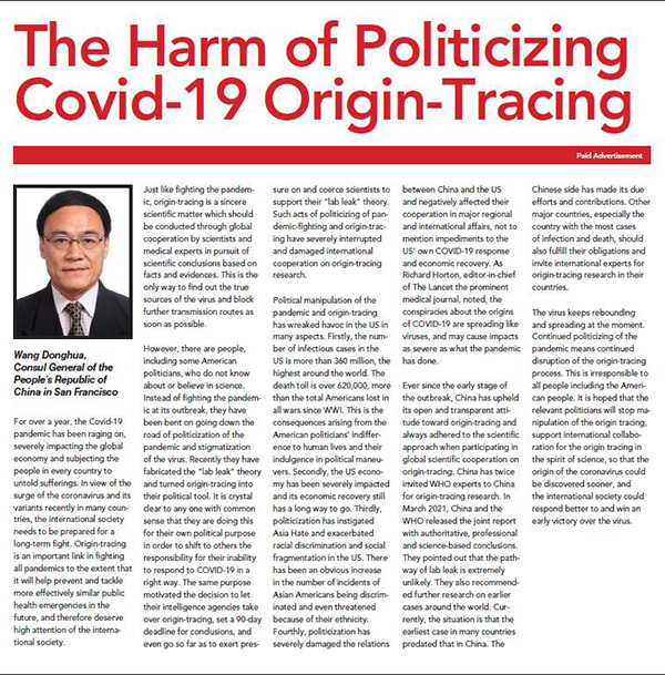 8月24日和25日,驻旧金山总领事王东华分别在当地英文主流媒体《旧金山观察家报》和华文媒体《星岛日报》(美西版)发表题为《将新冠病毒溯源工作政治化的危害》的署名文章,阐明中方坚持科学溯源,反对将病毒溯源问题政治化的立场。全文内容如下: