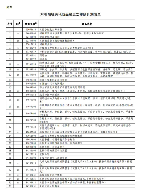 以下为对美加征关税商品第五次排除延期清单: