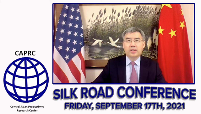 2021年9月17日,赵建总领事出席伊利诺伊州中亚生产力研究中心主办的第十五届丝绸之路年会(线上),并发表题为“‘一带一路’倡议:共商共建共享,共创美好未来”的主旨演讲。