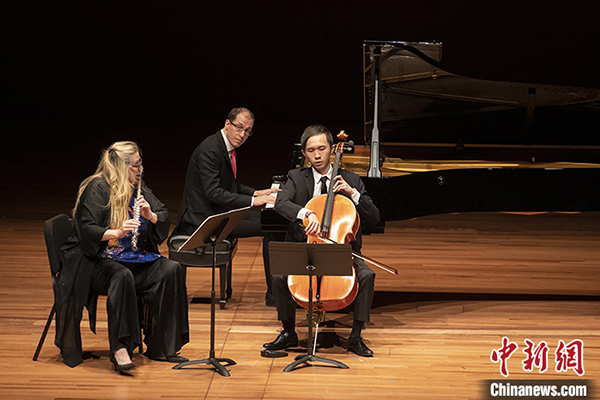 图为长笛演奏家塔拉·海伦·奥康纳(Tara Helen O'Connor)、钢琴家吉尔·冯萨特(Gilles Vonsattel)、青年大提琴家何思昊合作演奏作曲家林品晶作品《又一春》。 中新社记者廖攀摄