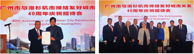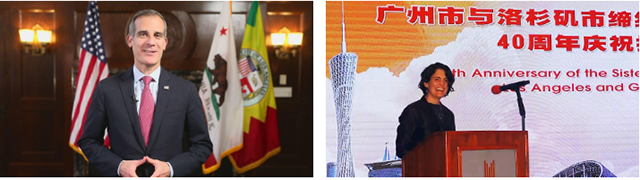 2021年12月8日,中国广东省广州市与美国加利福尼亚州洛杉矶市缔结友好城市关系40周年庆祝活动在洛杉矶市中心千禧酒店举办。洛杉矶市市长贾塞提、广州市副市长王焕清发表视频致辞。中国驻美国大使秦刚致信祝贺。中国驻洛杉矶总领事张平、洛杉矶市副市长贺琪珍、市议员德里昂以及洛杉矶—广州友城协会、洛杉矶市友城委员会负责人等各界嘉宾出席。