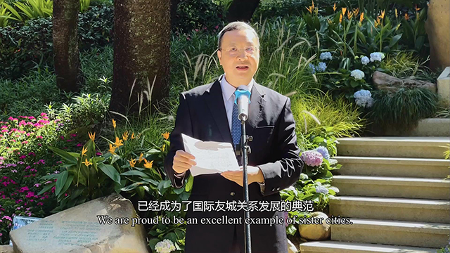 作为穗洛结好40周年系列庆祝活动之一,广州市政府于12月6日在越秀公园南秀园举办“广州—洛杉矶友谊花园”揭幕仪式。王焕清副市长在出席活动时表示,回首过去40年,广州和洛杉矶两市人员往来日益密切,交流领域不断拓展,经贸合作持续深化,友好情谊与日俱增,成为国际友城关系发展的典范。两市携手抗疫,生动诠释了守望相助的友城情谊。相信在双方共同努力之下,两地友谊将迈入新的阶段,为推动构建人类命运共同体、实现两地人民对美好生活的向往作出新的贡献。