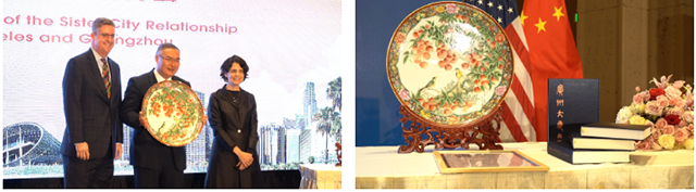 张平总领事将广州市政府向洛杉矶市政府赠送的广彩瓷盘和一套共计43册的《广州大典·曲类》转交贺琪珍副市长和洛杉矶市公共图书馆馆长萨博。洛广友协将代表洛杉矶市政府向广州市政府赠送的两市结好40周年纪念牌进行展示。