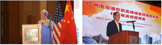 张总领事表示,尽管过去40多年中美关系历经波折起伏,但支持中美友好与合作的力量从未缺失,双方许多组织和个人为促进穗洛两市关系发展发挥了积极作用,做出了重要贡献,涌现出许多感人故事。张总领事指出,友城关系是民间外交的重要体现,有助于促进民心相通,推动地方交流合作。在中美两国正寻求新时期正确相处之道的关键时刻,我们应倍加珍惜和重视友城关系,不断增进两国城市和人民之间的交流合作和友好情谊。希望广州和洛杉矶以结好40周年为新起点,继续推动友城关系迈上新台阶,续写穗洛友谊与合作新篇章。