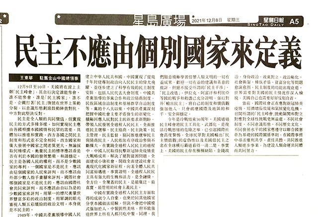 12月8日、9日,中国驻旧金山总领事王东华在《星岛日报》(美西版)、《旧金山观察家报》分别发表题为《民主不应由个别国家来定义》中英文署名文章,介绍中国全过程人民民主理念和民主建设成就,揭批美式民主弊端和虚伪性,呼吁世界各国加强合作,共同建设人类命运共同体。全文如下: