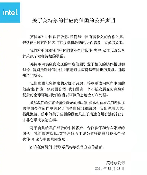 据媒体早前报道,美国英特尔公司官网12月发布的一封致供应商信中称,将确保其供应链不使用新疆产品或服务:“多个国家与地区的政府已对来自新疆地区的产品实行限制。因此,英特尔需要确保我们的供应链不使用任何来自新疆地区的劳工、采购产品或服务。”