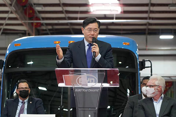当地时间3月1日,正在加利福尼亚州访问的中国驻美国大使秦刚专程前往位于洛杉矶北部的沙漠小城兰开斯特,在参观比亚迪(BYD)纯电动大巴工厂时说。