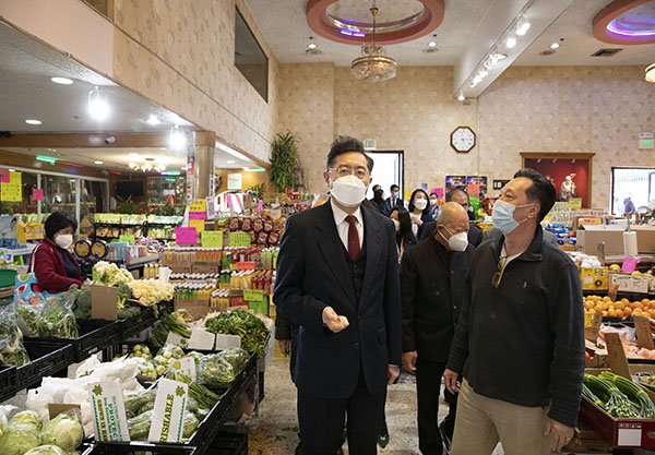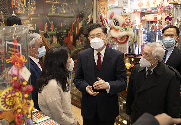 3月4日,秦刚大使走访加利福尼亚州旧金山唐人街,慰问当地侨胞,会见侨团代表。驻旧金山总领馆代总领事潘庆江参加。