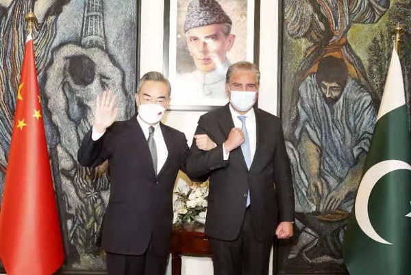 当地时间2022年3月21日,国务委员兼外长王毅在伊斯兰堡同巴基斯坦外长库雷希共同会见记者时介绍了应邀出席伊斯兰合作组织外长会的考虑。