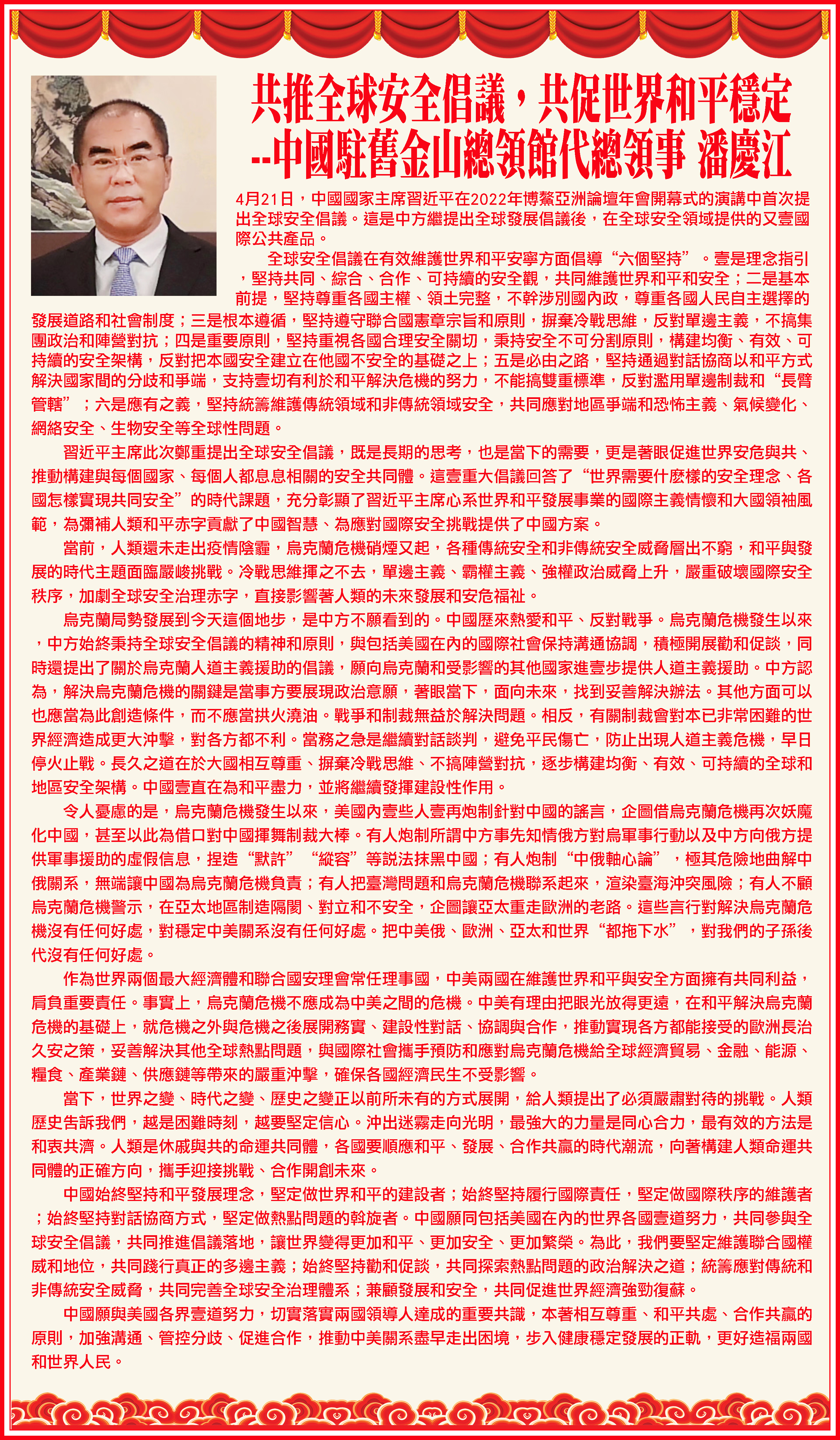4月27日,潘庆江代总领事在《星岛日报》(美西版)发表题为《共推全球安全倡议,共促世界和平稳定》的署名文章,全面介绍习近平主席日前提出的全球安全倡议重要内涵及意义,强调中国愿同包括美国在内的世界各国一道努力,共同参与全球安全倡议,共同推进倡议落地,让世界变得更加和平、安全、繁荣。全文如下:
