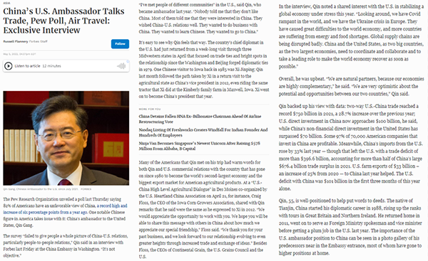 秦大使:我认为这个调查未能展示中美关系的全貌,特别是民间关系,并不客观。在美国我结识了方方面面的人士,去了一些州和地方,和商人、农民、学生、教师、工人交谈,没人告诉我不喜欢中国,大多数人表示对中国感兴趣,希望中美关系发展好。他们想和中国做生意,想学汉语,想去中国。大家都问我,疫情限制措施什么时候解除,希望明天就能去中国。所以两国民间友好基础仍在。如果有负面看法,我认为是一些反华政客编造和散布的虚假信息和谎言造成的,同时被一些媒体炒作放大。这不是中美关系的全部和真实面貌。