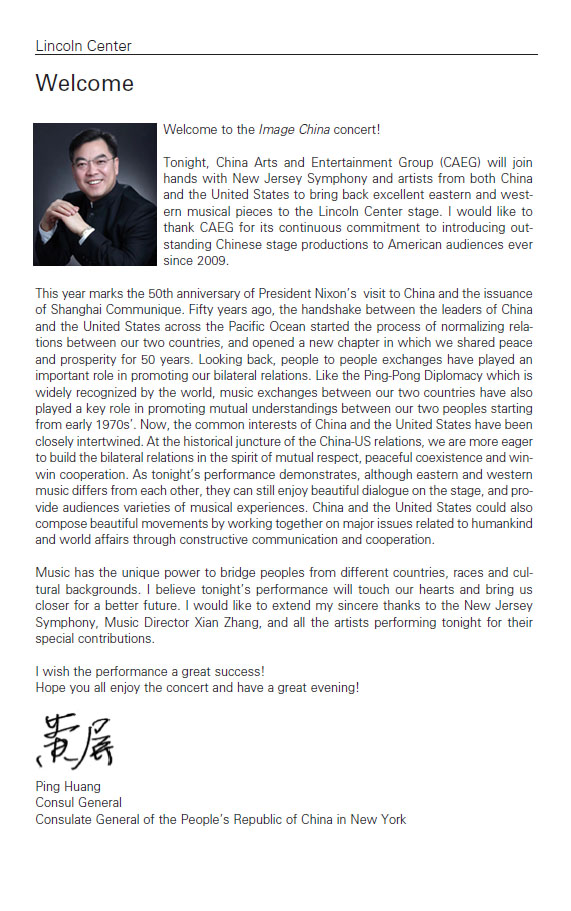 黄屏在贺辞中指出,今年是尼克松总统访华和“上海公报”发表50周年。50年来,人文交流在促进两国关系发展的过程中发挥了重要作用。正如今晚的演出所展示的,东西方音乐虽有差异,但仍能为观众带来多姿多彩的音乐体验。中美之间也可以通过建设性的沟通与合作,为两国人民和国际社会谱写美好的乐章。