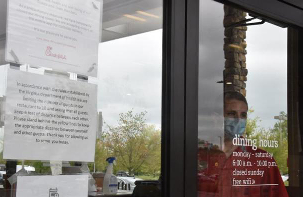当地时间4月24日,位于美国首都大华盛顿地区一连锁快餐店门口张贴标识,同一时间限10人入店,并要求顾客保持2英尺“社交距离”。 中新社记者 沙晗汀 摄