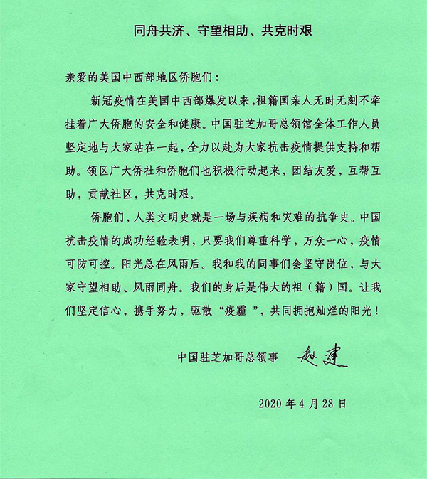 赵建总领事向领区侨胞发来慰问信,表示“新冠疫情在美国中西部爆发以来,祖(籍)国亲人无时无刻不牵挂着广大侨胞的安全和健康,驻芝加哥总领馆全体工作人员坚定地与侨胞站在一起,全力以赴为大家抗击疫情提供支持和帮助”,希望“领区广大侨社和侨胞们积极行动起来,坚定信心,携手努力,驱散‘疫霾’,共同拥抱灿烂的阳光!”
