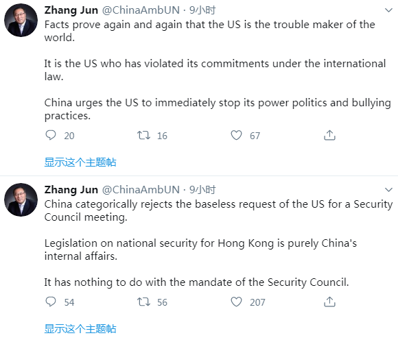 张军在推特上称,香港国安法是中国内部事务,毋须得到安理会授权。(图片来源:张军推特截图)