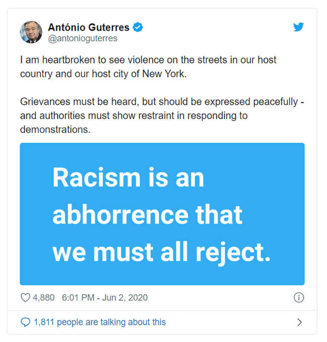 古特雷斯周二下午发推文说:“看到我们(总部)所在国家和我们所在城市纽约街头的暴力令我伤心欲绝。不满必须被倾听,但应该和平表达——当局在回应示威时必须表现出克制。”这条推文中插了一个图片,上面写着“我们必须每个人都对种族主义深恶痛绝。”