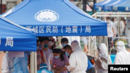 北京市民在广安体育中心外排队接受新冠病毒检测。(2020年6月15日)