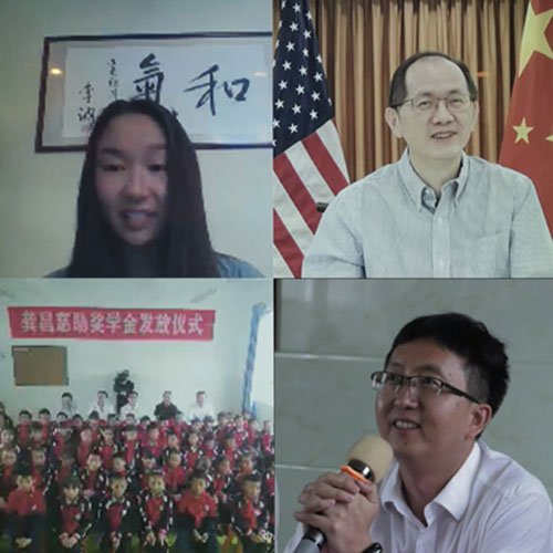 驻洛杉矶总领馆施远强副总领事在视频捐助仪式上向获得助奖学金的同学表示热烈祝贺,为同学们以坚强的意志战胜生活困难、在逆境中成长成才点赞加油。