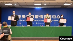 美国在台协会处长郦英杰(左一)与台湾外交部台湾美国事务委员会主任委员杨珍妮(右一)签署美、台“卫生合作备忘录“; 美国卫生部长阿扎尔(左二)与台湾的卫生部长陈时中(右二)签署“确认双方合作因应卫生挑战及疫情之意向书”。(台湾卫生福利部提供)