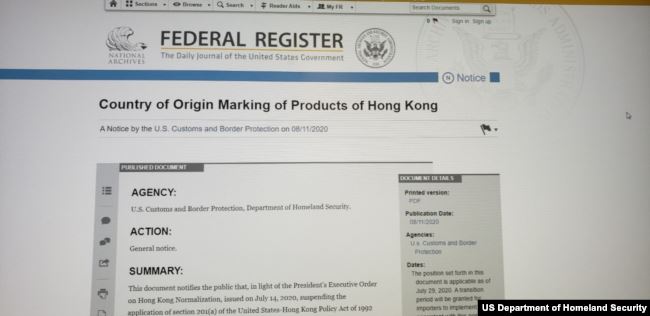 美国联邦公报发布最新草案:香港找商品将被标记为“中国制造”。