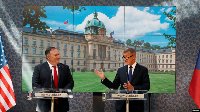 美国国务卿蓬佩奥(左)与捷克总理2020年8月12日共同见记者(路透社)