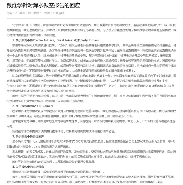 跟谁学对浑水做空报告的回应。(图片来源:跟谁学官网)