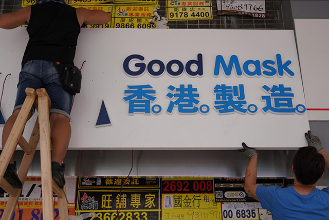 香港街头工人正在安装一个写有“香港制造”的牌匾。(图片来源:香港中通社)