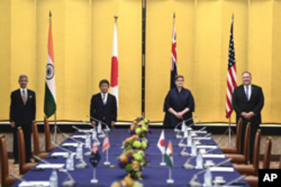 印度外长苏杰生、日本外相茂木敏充、澳大利亚外长佩恩和美国国务卿蓬佩奥在东京举行四方会谈。(2020年10月6日)