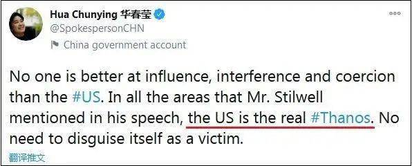 “没有人比美国更擅长影响、干涉和胁迫。在史达伟先生演讲中提到的所有领域,美国才是真正的灭霸。美国没有必要把自己伪装成受害者。”