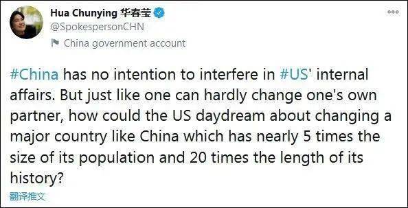 首先,华春莹指出:“中国无意干涉美国的内部事务。但是,就像一个人很难改变自己的伙伴一样,美国怎么能去幻想改变像中国这样一个人口接近它5倍、历史长20倍的大国呢?”