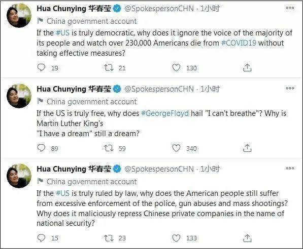 对于美国一直标榜的自由,华春莹指出:“如果美国真的自由,为什么乔治·弗洛伊德会喊出:‘我不能呼吸?’为什么马丁·路德·金的‘我有一个梦想’,仍是一个梦想?”