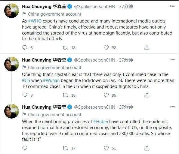 华春莹拿出事实:当武汉1月23日“封城”的时候,美国只有1例确诊病例。当美国暂停中国航班的时候,只有10例确诊病例。实际上,世卫组织(WHO)和许多国际媒体都同意,中国及时、有效且有力的疫情应对,不仅控制住了本国疫情,对全世界的疫情应对也有所贡献。