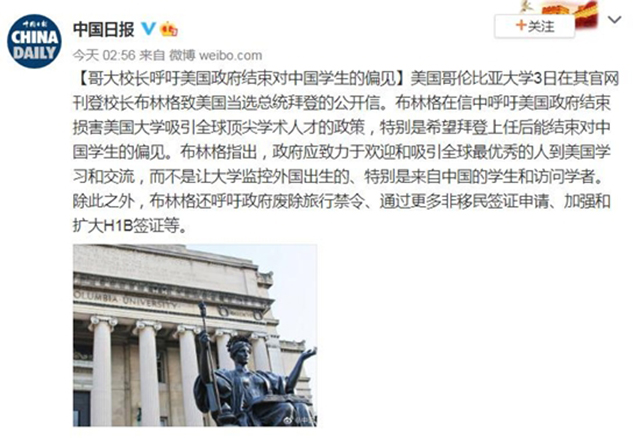 《中国日报》8日报道,哥伦比亚大学3日在其官网刊登校长布林格致美国当选总统拜登的公开信。布林格在信中呼吁美国政府结束损害美国大学吸引全球顶尖学术人才的政策,特别是希望拜登上任后能结束对中国学生的偏见。