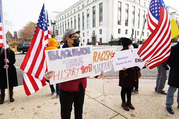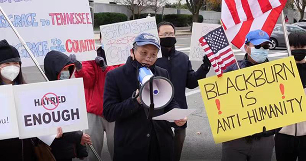 田纳西州联邦参议员玛莎·布莱克本(Marsha Blackburn)于12月3日在推特上发表涉嫌“辱华”的言论近日不断发酵。周三(12月9日)下午,由美国华人联合会(UnitedChineseAmericans,UCA)组织的抗议活动在哥伦比亚特区参议院办公大楼外举行。