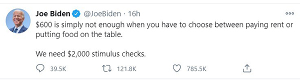 1月20日之后,民主党将实现同时控制国会参众两院和白宫的“完全执政”,拜登更加坚定地表达了对2000元直接发钱的支持。