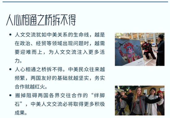 人文交流给两国人民带来实实在在的好处。美方数据显示,中国在美留学人员占在美全部留学生总数的三分之一,每年给美国贡献的价值超过150亿美元。美国保尔森基金会旗下“马可·波罗”智库去年发布报告显示,美国科研机构近三分之一的研究人员有中国教育背景,美国能够在人工智能领域取得全球领先地位,与来自中国的人才关系密切。